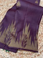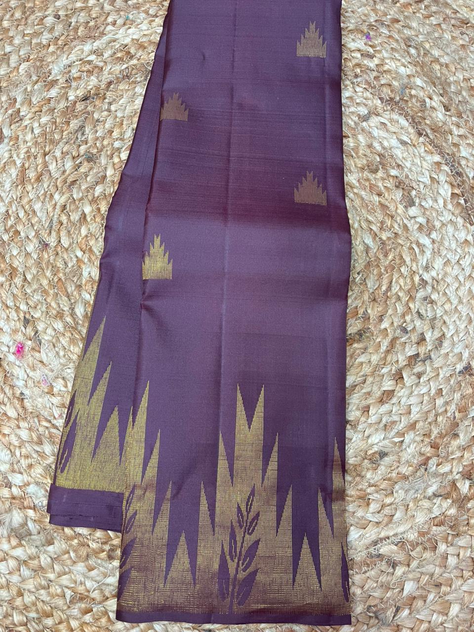 Description : This saree is a stunning piece of traditional Indian attire! 😍 It’s a chocolate brown colour with small gold motifs scattered across the saree. The saree has a striking green border with intricate gold zari. The border features a temple border pattern at the bottom with gold accents and a contrasting green pallu with detailed gold weaving. The combination of chocolate brown, green, and gold gives the saree a rich, and elegant look.