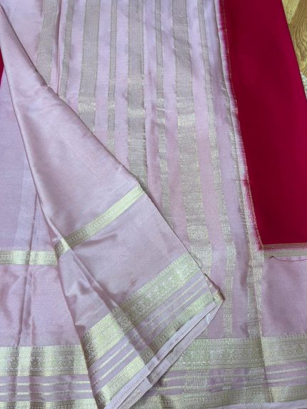 Description : This semi crepe silk saree is a stunning combo of dark teal and baby pink with some gorgeous gold detailing. The top part is dark teal, and the bottom has a pink pallu with intricate gold bentex borders and patterns.